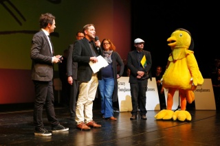 Preis Fachjury, Urkunde für das beste Vorschulprogramm: ICH KENNE EIN TIER: SCHNECKE mit Redakteur Benjamin Manns.